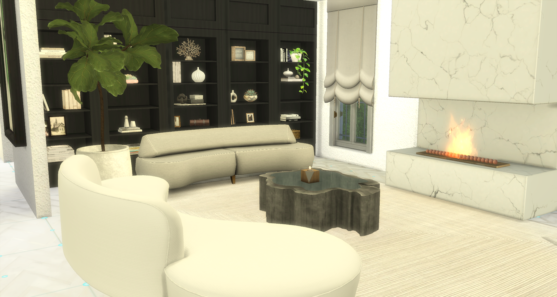 This build leans into a modern neutral palette with soft textures, marble finishes, and curated clutter to create a space that feels elevated but still warm.